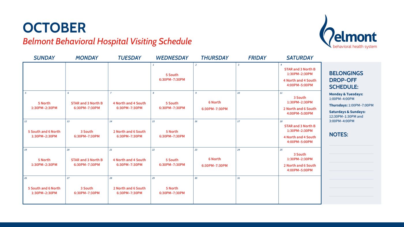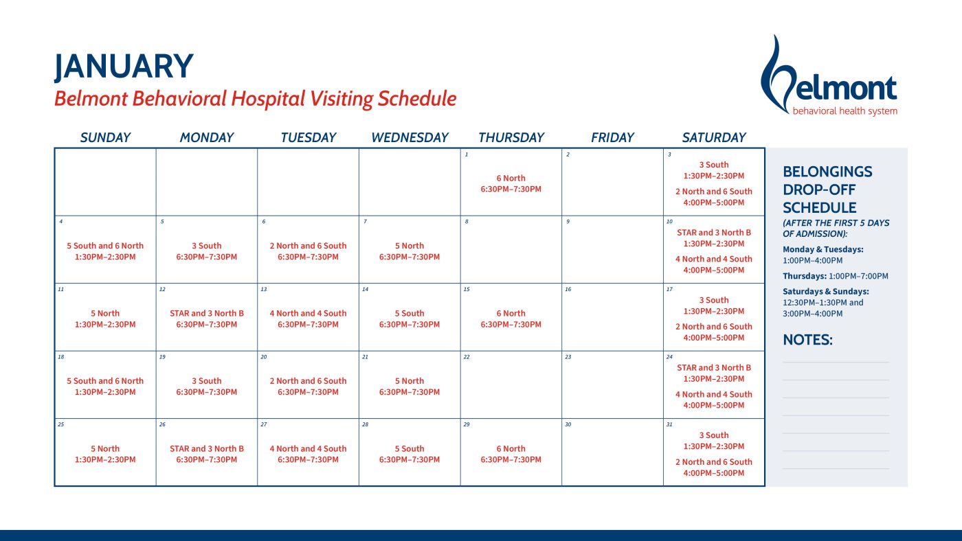 - Families/Supports are strongly encouraged to check the Belmont Behavioral Hospital Website prior to arriving to confirm that visiting will be occurring as planned.